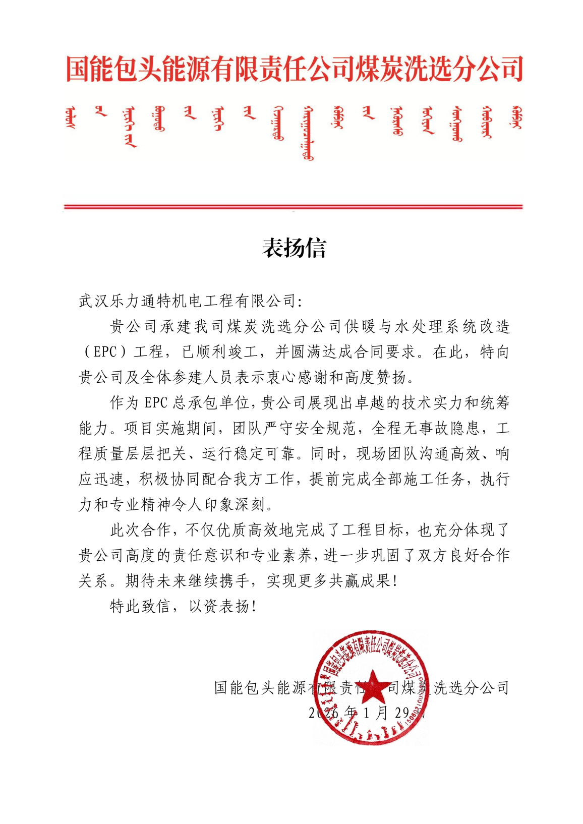 2025年10月,由乐力通特承接的韩家村选煤厂供暖与水处理系统改造(EPC)项目成功交付,经三个月运行,系统稳定达标,获业主表扬信。